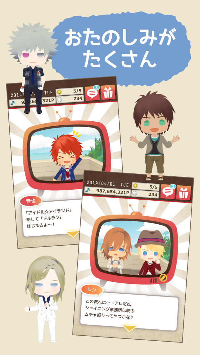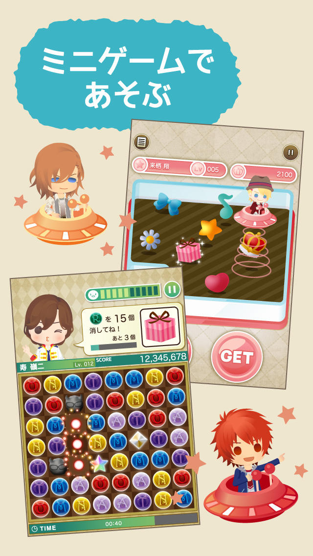 《歌之王子岛屿》是一款集合了在《歌之王子殿下》中登场的11名角色的休闲游戏,王子们即将化身Q版,与玩家在秘密的岛屿上渡过甜蜜生活。本作以休闲小游戏(三消、夹娃娃机等)为主。